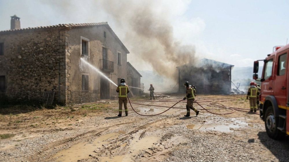 L'actuació segueix en marxa i es manté el dispositiu dels Bombers a la granja per controlar el foc i protegir l'entorn més pròxim.