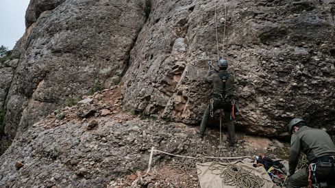 Els Agents Rurals desmunten aquest divendres cinc vies d'escalada a la zona de Can Jorba, al massís de Montserrat, dins del terme municipal del Bruc, després de l'accident registrat el dissabte 11 d'abril, quan van morir dues persones per la caiguda de pedres.