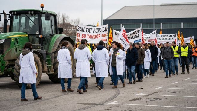 Una veintena de médicos se sumó este jueves en Girona a la manifestación de la huelga de maestros para visibilizar el malestar del colectivo y evidenciar que comparten parte de sus reivindicaciones. La concentración reunió a facultativos, docentes y agricultores en el aparcamiento de Fontajau, desde donde, tras los parlamentos, los sanitarios se incorporaron a la marcha junto a los maestros y acompañados por tractores.